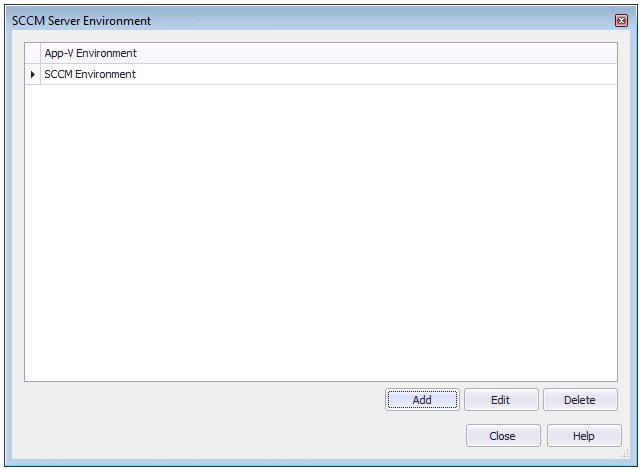 - Click App-V Virtual Environments in the ribbon and then select SCCM Server Environment. The SCCM Server Environment dialog box opens, listing any defined App-V virtual environments.