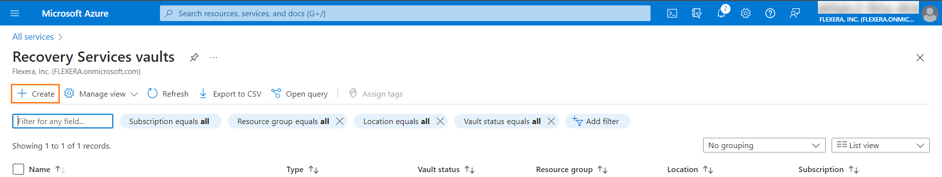 Upon successful action, a newly created recovery services vault will be listed in the Recovery Services vault page.