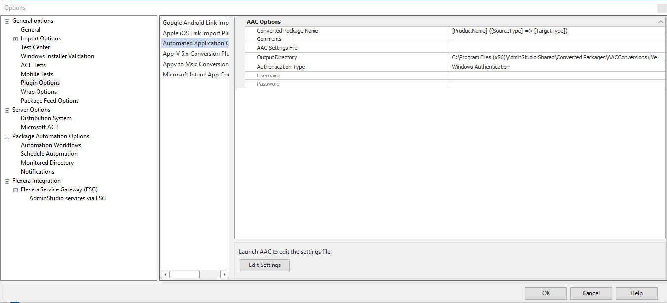 You can use the Conversion Wizard to convert a Windows Installer package, or multiple packages, to a virtual package in Microsoft App-V (version 4 or 5), Citrix XenApp, or VMware ThinApp format, or to perform repackaging on a virtual machine. Before performing this type of conversion, you need to enter Automatic Application Converter settings on the Plugins Options > Automated Application Converter Plugin tab of the Options dialog box.