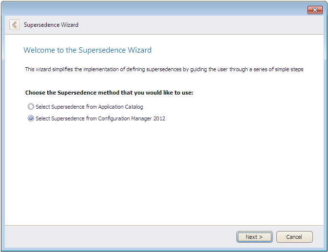 | Select Supersedence from Configuration Manager 2012 | Select to select a supersedent application from Configuration Manager 2012. |