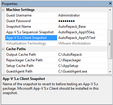 In the Properties window under Machine Settings, enter the name of this snapshot in the App-V 5.x Client Snapshot field.